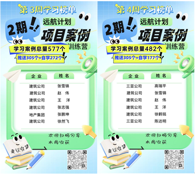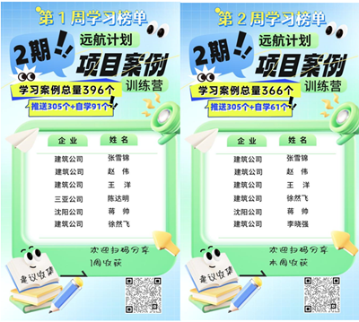 此次云端集结,不仅是一次知识的汇聚,更是一场赋能成长,本次训练营包括学前测试、四周线上项目案例推送学习以及学后测试三个环节。在为期四周的线上案例推送学习阶段,每周都会推送具有代表性和实用性的项目案例。这些案例覆盖了项目建设的全流程,项目种类多样、施工进度各异,既包括成功经验的分享,也包括失败教训的深刻剖析。