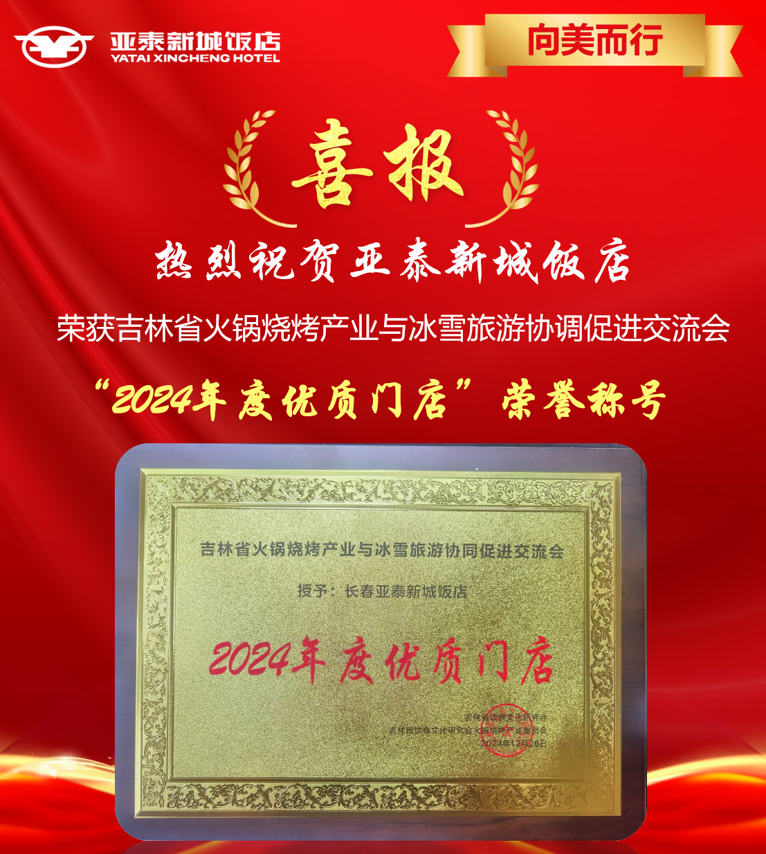 热烈庆祝亚泰新城饭店荣获《2024年度优质门店》