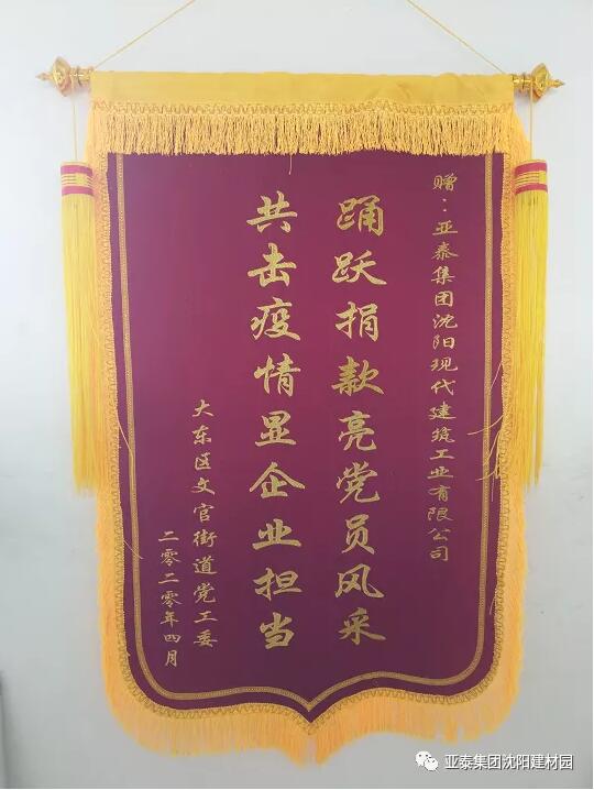 党员捐款统一由企业党支部捐到上级党工委,其中,中共亚泰集团沈阳现代建筑工业有限公司党支部将党员捐款捐到沈阳市大东区文官街道党工委,接到捐款后,沈阳市大东区文官街道党工委对抗击疫情中企业党支部做出的贡献表示感谢,对企业党支部高度赞扬,并授予企业党支部锦旗以兹鼓励。