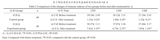 两组患者均在用药前及用药后 2 周后, 采用 FACSort 流式细胞仪检测患者血清中 CD3+、CD4+ 及CD8+ 等T 细胞亚群,来评估两组患者用药前后免疫功能的变化。