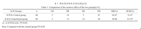 依据 1999 年美国临床肿瘤学会年会上提出的实体瘤疗效评价标准:(1)完全缓解(CR):实体瘤体积缩小一半以上,临床症状改善明显;(2)部分缓解(PR):实体瘤体积缩小三分之一以上,临床症状缓解;(3)疾病稳定(SD):实体瘤体积缩小三分之一以下或无变化,临床症状改善不明显;(4)疾病进展(PD):实体瘤体积增大,发现转移病灶,临床症状加重。有效率(RR)=(CR+PR)/ 总例数×100%,疾病控制率(DCR)=(CR+PR+SD)/ 总例数×100%。