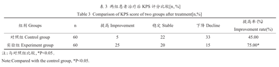 治疗后,实验组 KPS 评分提高率明显高于对照组,具有显著性差异(P<0.05)。见表 3。