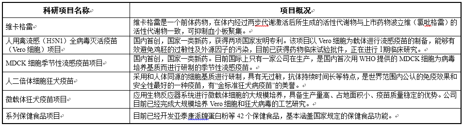 医药产业现已形成五大技术平台,包括三个生物技术平台(病毒在Vero细胞上适应筛选平台、罐培养技术平台、大规模病毒纯化平台)、中药质量标准与工艺研究平台和保健食品质量标准与工艺研究平台。